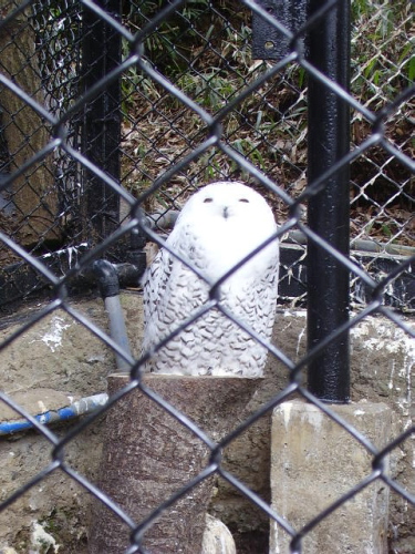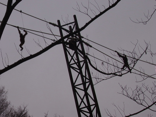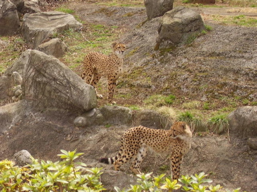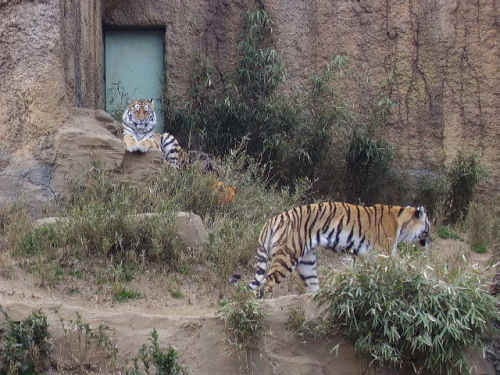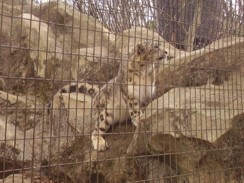 綱渡りしてるオランウータンが気になるらしいユキヒョウ
